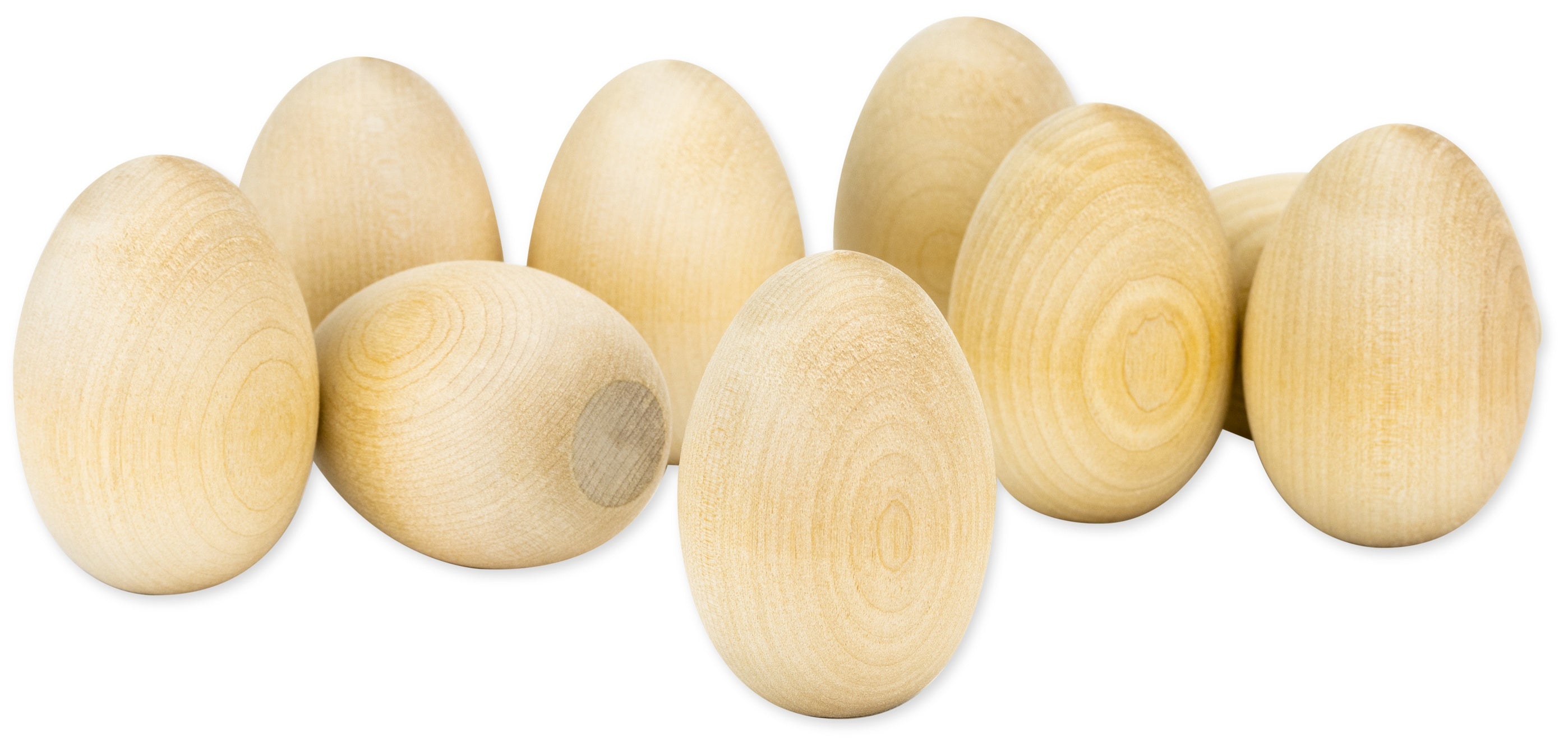 Celebrate creativity with this set of unfinished wood eggs, crafted from smooth, splinter-free natural wood. With a flat bottom for easy upright display, these eggs are perfect for Easter, spring décor, or year-round craft projects. Their sanded surface is ready to paint, stain, or embellish—and it goes great with craft papers for beautiful decoupage designs. Safe for kids and fun for adults, they accept a variety of mediums including paint, markers, glue, and more. Each package includes three 1.75" x 2.5" wood eggs, made in the USA and ready to be transformed into one-of-a-kind creations.