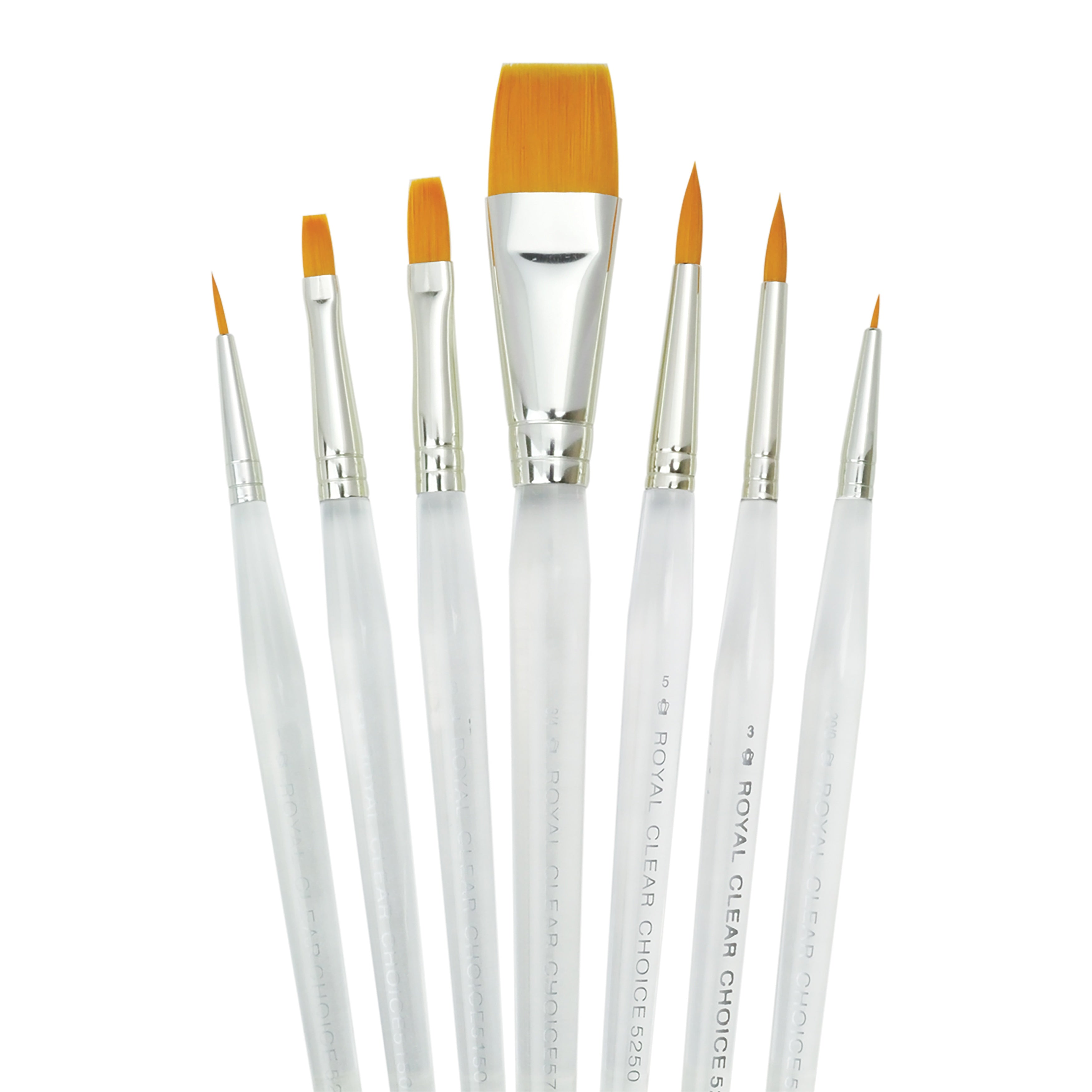 ROYAL LANGNICKEL- Upgrade your art toolkit with this 7-piece Clear Choice Brush Set, designed for versatility and smooth, reliable performance. Each brush features durable gold taklon bristles that work beautifully with acrylic, watercolor, and oil paints, delivering crisp strokes and excellent control. The clear acrylic handles offer a clean, modern look with a comfortable standard-length grip that’s easy to hold and easy to clean. A stylish and dependable set perfect for artists, crafters, and painters of all levels.